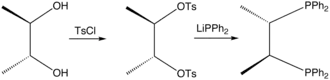 Chiraphos is prepared from S,S or R,R-2,3-butanediol, which are derived from commercially available S,S or R,R-tartaric acid; the technique of using cheaply available enantiopure starting materials is known as chiral pool synthesis. The diol is tosylated and then the ditosylate is treated with lithium diphenylphosphide.[1] The ligand was an important demonstration of how the conformation of the chelate ring can affect asymmetric induction by a metal catalyst. Prior to this work, in most chiral phosphines, e.g., DIPAMP, phosphorus was the stereogenic center.