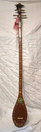 The whole instrument is made of mulberry wood, the body being carved from a single block with a thin wooden table and a very low bridge about the height of a matchstick. The strings pass over this bridge and are often fixed to a metal eye at the bottom of the body. The mulberry wood neck of the instrument is fixed to the body and there is a mulberry nut at the top leading to five carved wooden winders for the strings.