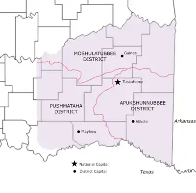 Before Oklahoma was admitted to the union as a state in 1907, the Choctaw Nation was divided into three districts: Apukshunnubbee, Moshulatubbee, and Pushmataha. Each district had its own chief from 1834 to 1857; afterward, the three districts were put under the jurisdiction of one chief. The three districts were re-established in 1860, again each with their own chief, with a fourth chief to be Principal Chief of the tribe.[27] These districts were abolished at the time of statehood, as tribal government and land claims were dissolved in order for the territory to be admitted as a state. The tribe reorganized to re-establish its government and passed a constitution re-establishing the council in 1979.[28][29] In the elections held that year, Harriet Wright O'Leary James became the first woman elected to serve on the nation's council.[29][30]