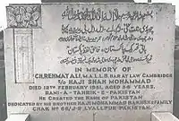 Rahmat Ali was born on 16 November 1897 into a Punjabi Muslim family. According to the historian K. K. Aziz, who knew Ali personally, he was from the Gujjar tribe.[7] He grew up in the town of Balachaur in the Hoshiarpur District of Punjab in British India.[8][9] After graduating from Islamia College Lahore in 1918, he taught at Aitchison College Lahore before joining Punjab University to study law. In 1930, he decided to move to England to study law at Emmanuel College, Cambridge which he joined in 1931. Subsequently, he obtained a BA degree in 1933 and MA in 1940 from the University of Cambridge. In 1933, he published a pamphlet, "Now or Never", coining the word Pakistan for the first time.[10] In 1943, he was called to the Bar, from Middle Temple, London.[11]