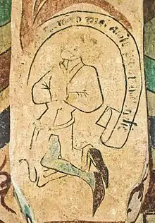 The technical execution as well as the iconography indicate that the artists who made the Romanesque murals were well educated.[7] Overall, however, very little is known about the artists and workshops who made the earliest murals in Swedish churches.[64] A few murals from the 13th century are signed, two in runes (Dädesjö Old Church, by Sigmund, and Anga Church, by Halvard) and one in majuscule (Veta Church by Magnus).[65][66] More detailed records about artists and workshops exist in some cases from the mid-15th century. The names of several of these artists have been preserved, either by signatures and inscriptions in the churches, or in city archives such as those in Stockholm and Arboga.[64] Albertus Pictor is the best known of these Late Gothic artists, already acquiring recognition and a following in his lifetime.[67] His signature is known from six churches, while Lid Church also contains his self-portrait.[68] His name is also mentioned in the city archives of Stockholm.[69] In other cases, where no written sources exist, art historians have assigned notnames to groups of works either assumed to have been made by the same workshop or more loosely to works showing certain stylistic similarities with each other.[70]