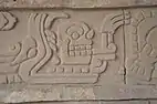 The 36-meter-long coatepantli of Tula depicts, in bas relief, serpents appearing to devour skeletal figures.[4] Some sources describe the figures as leaving the mouths of the snakes, and others describe them as being carried by the snakes.[7]