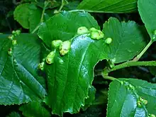 The common alder is susceptible to Phytophthora alni, a recently evolved species of oomycete plant pathogen probably of hybrid origin. This is the causal agent of phytophthora disease of alder which is causing extensive mortality of the trees in some parts of Europe.[18] The symptoms of this infection include the death of roots and of patches of bark, dark spots near the base of the trunk, yellowing of leaves and in subsequent years, the death of branches and sometimes the whole tree.[16] Taphrina alni is a fungal plant pathogen that causes alder tongue gall, a chemically induced distortion of female catkins. The gall develops on the maturing fruits and produces spores which are carried by the wind to other trees. This gall is believed to be harmless to the tree.[19] Another, also harmless, gall is caused by a midge, Eriophyes inangulis, which sucks sap from the leaves forming pustules.[20]
