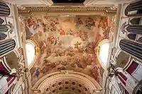 The original architect of the church was Antonio Sillero. The facade was designed by Juan Bautista de Toledo in 1559; who also helped in the roofing of the church. Parts of the altar, choir, and sacristy, were designed by Juan Gómez de Mora in 1612.[7] Gaspar Becerra in 1562 completed the main retablo of the altar, which was considered his master work. Unfortunately, this retablo was destroyed by fire in 1862, along with many of the paintings and frescoes by Juan Pantoja de la Cruz. In 1863 the altar was replaced by one commissioned in 1716 by Philip V of Spain to commemorate the beatification of the French Jesuit John Francis Regis, including canvases by Michel-Ange Houasse. It has a sculpted relief of the Apotheosis of Juan Francisco Régis, by Camillo Rusconi. The lateral panels were sculpted by Jose Bellver. The recumbent statue of the Jesuit was sculpted by Agostino Cornacchini.[3] A chapel contains the marble statue of Joanna of Austria at prayer, by either Pompeo Leoni or Crescenci.[4]