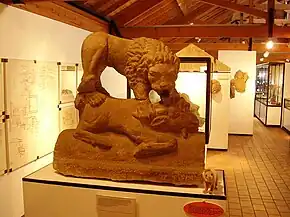 The Corbridge Lion, Northumberland, England, is an ancient Roman free-standing sandstone sculpture of a male lion standing on a prone animal (possibly a deer) on a semi-cylindrical coping stone base. Measuring 0.95m in length by 0.36m in width and 0.87m high, it was originally a piece of decorative funerary ornamentation from a tomb. It was subsequently re-used as a fountainhead by passing a water pipe through its mouth. It was found in a water tank in 1907 in excavations led by Leonard Woolley on Site II (a corridor building with tesselated floors, hypocausts, and painted wallplaster that has been suggested as a mansio or posting station) on the Roman site at Corbridge. It is believed to date to the 2nd or 3rd centuries AD.[1]