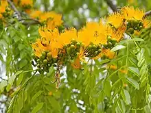 The mature bark is rough, dark brown and fissured, and a blaze showing yellow with orange streaks. The flowers are without petals and display yellow to orange stamens in axillary racemes 50mm long with up to 12 flowers, and these appear with the new leaves in September. As with Schotia flowers they face up and are nectar-filled, attracting a wide variety of birds.