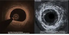Intracoronary imaging (ICI), consisting of intracoronary optical coherence tomography (OCT) and intravascular ultrasound (IVUS) can help distinguish SCAD from an atherosclerotic lesion when it is difficult to do so with angiography.[19] ICI techniques provide a direct view of the walls of the coronary artery to confirm SCAD, but may actually worsen the dissection as the probes are inserted into the damaged area.[4] ICI confers a 3.4% risk of iatrogenic dissection in people with SCAD compared to 0.2% risk in the general population.[4] Between the two ICI methods, OCT - a newer technique - has superior spatial resolution than IVUS and is the preferred technique if ICI is required,[4] but the need to inject extra contrast with OCT poses risk for worsening the dissection.[14]