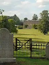 The village has developed around the Courteenhall House estate.[7] The landscaped park covers about 370 acres (150 ha), with formal gardens close to the house.[8] The estate was purchased from Richard Ouseley by Samuel Jones, the son of a London merchant, in 1647. Samuel was knighted in 1660, was High Sheriff of Northamptonshire for 1652–53 and died in 1673. His estates were inherited by his great-nephew Samuel Wake, a younger son of Sir William Wake, 3rd Baronet of Piddington. The Wake family is reputedly descended from Hereward the Wake, a Saxon hero of resistance to the Norman Conquest of England.[9] The park was designed in 1791 by Humphry Repton sic[6][7] for Sir William Wake, 9th Baronet. The Hall, like the park, dates from 1791 on a site selected by Repton and is by a little-known architect Samuel Saxon.[7] It is private property but may be viewed in the distance from Courteenhall village church. Although sheep graze over the grounds of the main park, they are kept out of the Hall's garden by a ha-ha. Courteenhall House is still occupied by the Wake family, the head of which being Sir Hereward Charles Wake, 15th Baronet.