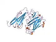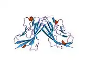 Coxsackievirus and adenovirus receptor (CAR) is a protein that in humans is encoded by the CXADR gene.[5][6][7] The protein encoded by this gene is a type I membrane receptor for group B coxsackie viruses and subgroup C adenoviruses. CAR protein is expressed in several tissues, including heart, brain, and, more generally, epithelial and endothelial cells. In cardiac muscle, CAR is localized to intercalated disc structures, which electrically and mechanically couple adjacent cardiomyocytes. CAR plays an important role in the pathogenesis of myocarditis, dilated cardiomyopathy, and in arrhythmia susceptibility following myocardial infarction or myocardial ischemia. In addition, an isoform of CAR (CAR-SIV) has been recently identified in the cytoplasm of pancreatic beta cells. It's been suggested that CAR-SIV resides in the insulin secreting granules and might be involved in the virus infection of these cells.[8]