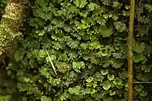 Crepidomanes minutum is a small fern which grows epipetrically or epiphytically.[3][4] It tends to grow in moist, low elevation forests where moisture is abundant and can tolerate deep shade.[5] It has long-creeping rhizomes from which its leaves arise. The rhizome does not have roots but instead has rhizoids. Its leaves range from 1.5cm long to 6cm, and are flabellate to 1-4 times pinnate but may also be palmately lobed in some individuals.[6][3] Leaves also have buds which allow individual leaves to proliferate and branch. It looks much like a moss and may be confused as one without careful examination.