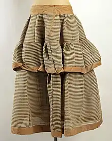 Petticoats made of horsehair crinoline appeared around 1839, proving so successful that the name 'crinoline' began to refer to supportive petticoats in general, rather than solely to the material.[14] By 1847, crinoline fabric was being used as a stiffening for skirt linings, although English women preferred separate crinoline fabric petticoats which were beginning to collapse under the increasing weight of the skirts.[15] One alternative to horsehair crinoline was the quilted petticoat stuffed with down or feathers, such as that reportedly worn in 1842 by Lady Aylesbury.[16] However, quilted skirts were not widely produced until the early 1850s.[16] In about 1849, it was possible to buy stiffened and corded cotton fabric for making petticoats, marketed as 'crinoline', and designed as a substitute for the horsehair textile.[17] The artificial crinoline with hoops did not emerge until the 1850s.[15]