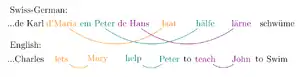 As Swiss-German allows verbs and their arguments to be ordered cross-serially, we have the following example, taken from Shieber:[4]