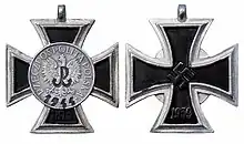 The Cross of the Warsaw Uprising (Polish: Krzyż Powstania Warszawskiego) was an informal award used by soldiers of the Polish resistance during the Warsaw Uprising of 1944.[1] It consisted of a captured German Iron Cross, with a pre-war 1 złoty coin pinned to it in the centre over the swastika; the reverse side of the coin, showing the Polish eagle, was displayed, to which was added a kotwica and the inscription "1944".[2][3] It was awarded for killing an SS officer in combat and made during quieter periods in between the fighting.[1][2]