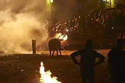 The "Toro Jubilo" or Toro embolado in Soria, Medinaceli, Spain, is a festival associated with animal cruelty. During this festival, balls of pitch are attached to a bull's horns and set on fire. The bull is then released into the streets and will run around in pain, often smashing into walls in an attempt to douse the fire as spectators attempt to dodge the animal. The pitch balls can burn for hours, and they burn the bull's horns, body, and eyes. The animal rights group PACMA has described the fiesta as "a clear example of animal mistreatment".[72]