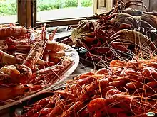 Moors also developed the basis for the art of pastry-making and introduced escabeche,[14] a food preservation technique relying on vinegar. Dishes like ajo blanco, alboronía,[15] alajú,[16] hallulla,[17] albóndigas,[18] mojama,[19] arrope,[20] are some of the many legacies of Moorish cuisine.[21][13][22] Although Muslim religion does not allow alcoholic drinks, the consumption of wine was widespread as the Qur'anic precepts never got to overrule the preexisting traditions in this regard.[23] There are many accounts of the "drinking chats" of Abd al-Rahman II, Abd al-Rahman III and Almanzor.[24] Almodrote (a formerly popular sauce preparation out of vogue since the late 17th century) was a Sephardic recipe in origin.[25] Observing the kashrut regulations, Jews and judaizantes opted for blood-drained meat and without fat, outright rejecting bacon.[26] Potajes were an important part of the Jewish cuisine in the Middle Ages, most notably adafina, a local name for a ḥamin dish,[27] along with other Jewish culinary legacies in Spain since.[28][29][30] The cookbook history in the country might be traced back to works such as the Llibre de Sent Soví (1324) and Ruperto de Nola's Llibre de Coch (1520),[31] both written in the Catalan language.