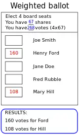 Cumulative voting (also accumulation voting, weighted voting or multi-voting) is a multiple-winner method intended to promote more proportional representation than winner-take-all elections such as block voting or first past the post. Cumulative voting is used frequently in corporate governance, where it is mandated by some (7) U.S. states[1] (see, e.g., Minn. Stat. Sec. 302A.111 subd. 2(d)).