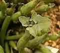 The plant features bluish green or grey sausage-shaped stems, and leaves (which appear 50% of the time) that are olive green atop and purplish below. It is usually dormant and leafless for most part of the year, but would come to life in winter with new leaves and white to pinkish discoid flowers. It forms a sprawling clump or a subshrub that is 22-40 cm high (though much taller if shaded and overwatered) and would spread by tubers which develop an underground mainstay system.