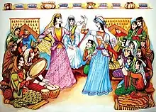 Girl's mother prepares dowry for her daughter for several years. Several days before wedding ceremony, they bring dowry of the bride to boy's home. Dowry[14] is consist of at least bedroom furniture, home accessories and personal belongings of girl. Some of the relatives of girl comes to decorate girl's room. Mother-in-law of girl gives the gift to her for decorating the room.[15]