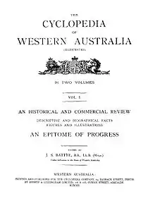 - Battye, J.S. The Cyclopedia of Western Australia : an historical and commercial review : descriptive and biographical facts, figures and illustrations : an epitome of progress Adelaide: Printed and published for the Cyclopedia Company by Hussey & Gillingham, 1912. 2 volumes - . (xv, 775; xv, 1025 )