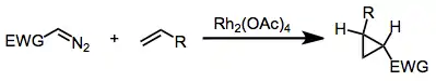 Methyl phenyldiazoacetate and many related diazo derivatives are precursors to donor-acceptor carbenes, which can be used for cyclopropanation or to insert into C-H bonds of organic substrates. These reactions are catalyzed by dirhodium tetraacetate or, more spectacularly, related chiral derivatives.[12] [13][14]