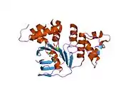 The CFTR gene is approximately 189 kb in length, with 27 exons and 26 introns.[34] CFTR is a glycoprotein and is found on the surface of many epithelial cells in the body.[35] CFTR consists of 5 domains, which include 2 transmembrane or membrane-spanning domains, 2 nucleotide-binding domains and a regulatory domain.[36] The transmembrane domains are each connected to a nucleotide binding domain (NBD) in the cytoplasm. The first NBD is connected to the second transmembrane domain by a regulatory "R" domain that is a unique feature of CFTR, not present in other ABC transporters which carries 19 predicted sites for protein kinase A(PKA). Six of these have been reported to be phosphorylated in vivo.[37] The ion channel only opens when its R-domain has been phosphorylated by PKA and ATP is bound at the NBDs. Phosphorylation displaces the disordered R domain from positions preventing NBD dimerization and opening.[38][39] The amino-terminus is part of the lasso motif which anchors into the cell membrane.[37] The carboxyl terminal of the protein is anchored to the cytoskeleton by a PDZ-interacting domain.[40] The structure is shas(PDBitsI) shows a homopentameric assembly of mutated NBD1, the first nucleotide binding domain (NBD1) of the transporter