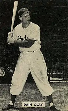 Dain Elmer Clay (July 10, 1919 – August 28, 1994) was a Major League Baseball outfielder. He played for the Cincinnati Reds of the National League. Clay played collegiately at Kent State University in 1943. He played in four seasons with the Reds, from 1943 to 1946. In 1945, Clay led the National League in at-bats with 656, and was sixth in games played, with 153. In 433 games, Clay was a .258 career hitter (397-for-1540) with 3 home runs and 98 runs batted in.
