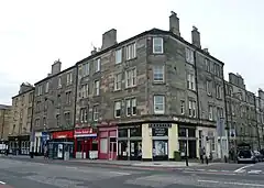 A series of railway works, the 'Dalry Road Depot' also existed to the east of Dalry, including a goods yard and several engine sheds. These were demolished in the 1960s (with the main engine shed being demolished in October 1965) and converted into flats, parkland and a supermarket in the late 20th century.[28] The site is part of the West Approach Road and a park. The railway works served the former Wester Dalry Branchline, which was a part of the Caledonian Railway to Leith from the now defunct Edinburgh Princes Street railway station. The railway had two stops in Dalry; 'Dalry Road' and 'Dalry Junction'. The Dalry Road Stop was a passenger station, built to meet demand following the tenement building boom in Dalry, and it opened in 1894.[18] The station closed on 30 April 1962.[29] The line is now closed and removed; a small section of the platform is visible on a park path near Orwell Terrace.[30] The section of the line between Haymarket West Junction and the Dalry Junction station is now a roadway, the West Approach Road which takes traffic directly into the city centre.