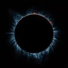 Since 2011 Loeb has been focused on painting scenes of Earth and its celestial environs, all based on his own photographs, capturing a wide range of astronomical phenomena.[19] In 2017 he traveled to Jackson Hole, Wyoming, to capture the total solar eclipse visible from North America, using a hydrogen alpha telescope with an attached camera to observe and record the two minute and twenty-two second phenomenon. The resulting works were exhibited by Acquavella in a solo exhibition at Frieze New York in May 2019. Despite the evident precision of the works, they continued to aim to capture a remembered feeling, a sense of awe.[20] “Pushing the landscape genre into the realm of the extraterrestrial, Damian Loeb gives the nineteenth-century Romantic sublime a twenty-first-century reboot by depicting vistas that would have been inconceivable in earlier eras, such as view from airplanes and the Hubble telescope, Loeb’s glossy hyperrealist style has a distinct digital vibrancy, though his large-scale canvases call for an extended contemplation not commonly associated with digital images,” wrote art historian Robert Shane in Landscape Painting Now. “His most recent work marks a conceptual break with his earlier narrative scenes based on appropriated film stills, though his landscapes still retain a cinematic drama.”[21]