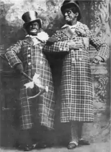 Hill's tour continued, finally closing on May 22, 1897, in Cleveland. Montgomery spent the summer in New York and Stone with his family in Chicago, a pattern they would repeat for the length of their partnership.[8] The Russell Brothers show opened on October 2, 1897, at the Olympic Theatre in Chicago. While still in blackface, Montgomery and Stone had a new comic song and dance act that had shed its minstrel origins.[8] A review of the show said "Montgomery and Stone, in blackface, gave excellent imitations of real politicians, the hobby of the day, and by their singing and quaint expressions, as well as their startling moves, kept the audience laughing and applauding."[9]