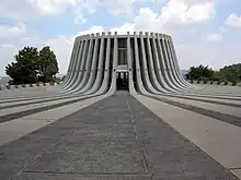 His other works in Israel include Jerusalem's Hyatt Regency Hotel, the Brigham Young University Jerusalem Center,[10] Yad Kennedy (the John F. Kennedy Memorial outside of Jerusalem), and the Antiquities Museum in Hatzor (in Kibbutz Ayyelet ha-Shahar), and the Soldiers Home complex (Yad lebanim).[6] The assignment to create Yad Kennedy was the result of a nationwide competition.[11] A memorial to the life of U.S. President John F. Kennedy and his assassination in 1963, the 60 feet (18 m) high memorial is shaped like the trunk of a felled tree, symbolizing a life cut short.[12]
