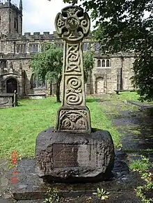 The Protestant martyr, George Marsh, a farmer's son, was born in Deane in 1515. When Edward VI became King in 1547, Marsh's study of the New Testament led to his appointment as a preaching minister. When Edward VI died in 1553, his half-sister Mary I became Queen. She sought to re-establish Roman Catholicism, Marsh became victim to her persecution of the reformers. He appeared before Justice Barton at Smithills Hall accused of preaching false doctrines. Imprisoned at Chester, he refused to deny his beliefs, was tried, convicted, and burnt at the stake on April 24, 1555.[10][11] A memorial was erected in the churchyard in 1893, it is a Grade II listed structure.[12]