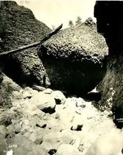 Four miles from its mouth at the Spokane River, the Deep Creek valley opens up into the valley of Coulee Creek, which flows in from the west. It is here that Deep Creek enters Riverside State Park.[8] Both creeks begin a descent into a thin, deep canyon just before Cable Creek empties into Deep Creek. The canyon is flanked by near vertical basalt walls that are in places vertical cliffs 100 apart. The area is popular with hikers[9] and rock climbers.[10] A bridge carrying the Spokane River Centennial Trail crosses over the creek at its mouth. The community of Nine Mile Falls is located across the Spokane River from the mouth of Deep Creek.