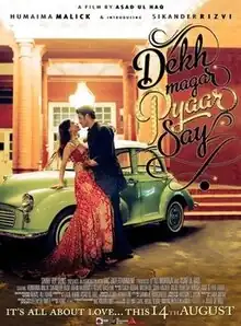 Dekh Magar Pyaar Say is a 2015 Pakistani romantic comedy film directed by Asad ul Haq and produced by Ali Murtaza [1] under the production banner Shiny Toy Guns. The film was the directorial debut for Haq. The movie starred Humaima Malick and Sikander Rizvi in the lead roles.[2] The latter made his film debut with the movie.[3]