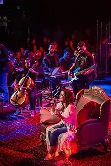 Since the first album, the group has had roots of congregational singing in instrumental part.[136] The band's orchestra was a hallmark of the group's works released between 1998 and 2010, making the heavy, dense sound of brass the main musical feature of the group.[137] The departure of the band's orchestra brought a renewal of the group's arrangements from the 2011 album Sol da Justiça. Since then, the Diante do Trono has taken on pop rock influences in their arrangements.[138]