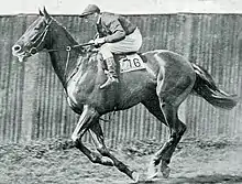 On 4 May 1925 Diophon contested the Lingfield Park Spring Stakes and finished second, beaten a head by Sansovino, with the Argentinian colt El Cacique three lengths back in third.[15] At Newbury Racecourse on 10 June he was assigned a weight of 140 pounds for the Royal Plate and won from Glommen and Invershin despite struggling to obtain a clear run in the straight. It was said by the Sporting Life that "no horse could have battled more heartily" and that the impression that he sometimes gave less than his best effort was created by the colt's oddly-set ears.[16] He then finished second to Caravel in the Rous Memorial Stakes over one mile at Royal Ascot, beaten a head in a "great finish".[17] In the Eclipse Stakes at Sandown Park on 17 July he came home third behind Polyphontes and Zambo in a thirteen-runner field.[18] In the same month he won the £2595 Atlantic Cup at Liverpool.[19] In August Diophon added an "easy" win in the Great Midland Breeders' Plate over ten furlongs at Nottingham Racecourse.[20]