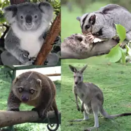 | Clockwise from upper left: female koala (Phascolarctos cinereus), mahogany glider (Petaurus gracilis), young eastern grey kangaroo (Macropus giganteus) and Sulawesi bear cuscus (Ailurops ursinus) | |