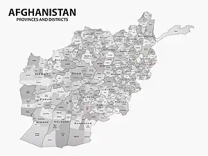 The districts of Afghanistan, known as wuleswali (Pashto: ولسوالۍ, wuləswāləi; Persian: شهرستان, shahrestān), are secondary-level administrative units, one level below provinces. The Afghan government issued its first district map in 1973.[1][2] It recognized 325 districts, counting wuleswalis (districts), alaqadaries (sub-districts), and markaz-e-wulaiyat (provincial center districts).[2] In the ensuing years, additional districts have been added through splits, and some eliminated through merges. In June 2005, the Afghan government issued a map of 398 districts.[3] It was widely adopted by many information management systems, though usually with the addition of Sharak-e-Hayratan for 399 districts in total. It remains the de facto standard as of late 2018, despite a string of government announcements of the creation of new districts.