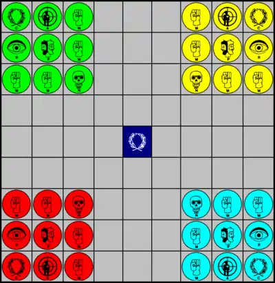 The pieces are placed in each corner of the board as shown in the picture above. Order of play is red - blue - yellow - green.
