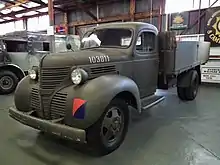 After Dodge supplied the U.S. Army with its first four-wheel drive truck in 1934, more modern 1+12-tonners were developed, and 1,700 RF-40-X-4(USA) trucks were supplied in 1938, and 292 TF-40-X-4(USA) in 1939.[17][18] In 1940, Dodge gained an Army contract to design and build 12-ton 4×4 military trucks in several styles using many commercial truck parts. Based on the VC-Series, and internally called the T-202 series, the VC-1 through VC-6 came with essentially stock front-end sheetmetal. Similarly, their 116-inch wheelbase and 201-cubic-inch 79-horsepower six-cylinder engine shared much with Dodge's civilian 12-ton VC. The following year, the T202 was replaced by the T-207 series trucks. Again rated as 12-tonners, they featured a military-specific hood, grille, and fenders. These trucks were powered by the 218-cubic-inch six of 85 horsepower taken from Dodge's 34- and one-ton commercial models.[14] Eventually, the military trucks were substantially redesigned, and uprated to 34-tons with a 230-cubic-inch engine producing 92 hp. Together with the 12-tons of 1941, these were built from 1942 until the end of the war as the Dodge WC series military trucks. Some 30 were modified as armored trucks by the French in Syria prior to WWII and known as the Automitrailleuse Dodge Tanake.[19] The Tanake was fitted with a 37mm cannon M1916 and two or three FM 24/29 light machine guns and a crew of 5.[20] The vehicles served with French Foreign Legion, both Vichy and Free French units during WWII and post-war used by the Syrian government in the 1948 Arab–Israeli War.[19]
