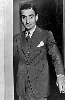 Born in Imperial Russia, Berlin arrived in the United States at the age of five. He published his first song, "Marie from Sunny Italy", in 1907, receiving 33 cents for the publishing rights,[4] and became known as the composer of numerous international hits, starting with 1911's "Alexander's Ragtime Band". He also was an owner of the Music Box Theatre on Broadway. For much of his career, Berlin could not read sheet music, and was such a limited piano player that he could only play in the key of F-sharp; he used his custom piano equipped with a transposing lever when he needed to play in keys other than F-sharp.[5] He was known for writing music and lyrics in the American vernacular: uncomplicated, simple and direct, with his stated aim being to "reach the heart of the average American," whom he saw as the "real soul of the country".[6]