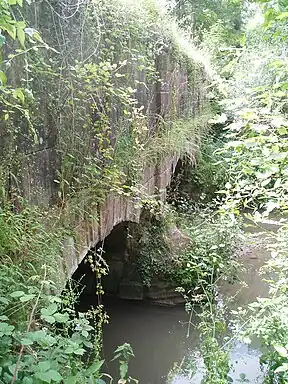 Several features are still visible including a bridge that once carried the Edford to Stratton Common road over the canal[12] and an aqueduct at Coleford, with two semi-circular arches nearly 33 feet (10 m) across and a similar height.[13] The boat lift at Barrow Hill was the site of archaeological excavations in 2007.[14] The three-arched aqueduct over the River Mells at Murtry Bottom still has some 56 feet (17 m) of retaining wall attached to it.[5] A project to consider how best to conserve it has been aided by a grant from the Somerset Aggregates Levy Sustainability Fund.[15]