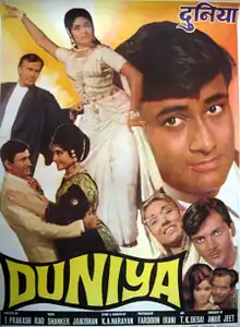 Duniya (transl. The World) is a 1968 Indian Hindi-language romantic thriller film written by K. A. Narayan and directed by T. Prakash Rao. The film starred Dev Anand, Vyjayanthimala in the lead with Balraj Sahni, Johnny Walker, Lalita Pawar, Prem Chopra, Sulochana Latkar, Madan Puri, Nana Palsikar, Achala Sachdev, Laxmi Chhaya, Jagdish Raj, Tun Tun, Brahm Bhardwaj and Pakistani actor Suresh as the ensemble cast. The film was produced by Amarjeet.[1][2] The film's score was composed by Shankar Jaikishan duo with lyrics provided by Hasrat Jaipuri, S. H. Bihari and Gopaldas Neeraj, edited by Shivaji Awdhut and was filmed by Faredoon A. Irani. The story revolves around three friends (Amarnath, Gopal, and his sister, Mala), how they face their problems in life, and how they recover from the problems in the rest of the story.