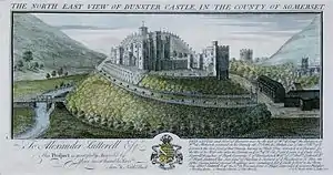 Dunster Castle was positioned on a steep, 200-foot-high (60 m) hill, sometimes called the Tor, overlooking the village of Dunster in Somerset.[1][nb 1] During the early medieval period the sea reached the base of the hill, close to the mouth of the River Avill, offering a natural defence and making the village an inland port.[3] Several Iron Age hillforts were built close to Dunster, including Bat's Castle, Black Ball Camp and Grabbist Hill, but the earliest evidence of a fortification at Dunster was an Anglo-Saxon burgh.[4] This was built on the summit of the hill and was possibly intended to protect the region against sea-borne raiders; by the mid-11th century it was controlled by a local nobleman called Aelfric.[5]