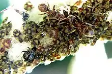 Another mechanism of facilitation is a reduced risk of being eaten. Nurse plants, for example, not only reduce abiotic stress, but may also physically impede herbivory of seedlings growing under them.[3] In both terrestrial and marine environments, herbivory of palatable species is reduced when they occur with unpalatable species.[1][3][4] These "associational refuges" may occur when unpalatable species physically shield the palatable species, or when herbivores are "confused" by the inhibitory cues of the unpalatable species.[1][3] Herbivory can also reduce predation of the herbivore, as in the case of the red-ridged clinging crab (Mithrax forceps) along the North Carolina, US, coastline.[9] This crab species takes refuge in the branches of the compact ivory bush coral (Oculina arbuscula) and feeds on seaweed in the vicinity of the coral. The reduced competition with seaweed enhances coral growth, which in turn provides more refuge for the crab. A similar case is that of the interaction between swollen-thorn acacia trees (Acacia spp.) and certain ants (Pseudomyrmex spp.) in Central America.[2] The acacia provides nourishment and protection (inside hollow thorns) to the ant in return for defense against herbivores. In contrast, a different type of facilitation between ants and sap-feeding insects may increase plant predation.[2] By consuming sap, plant pests such as aphids produce a sugar-rich waste product called honeydew, which is consumed by ants in exchange for protection of the sap-feeders against predation.