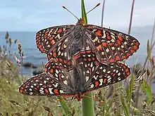 Edith's checkerspot (Euphydryas editha) is a species of butterfly in the family Nymphalidae. It is a resident species of western North America and among the subspecies, entomologists have long been intrigued by their many phenotypic variations in coloration, wing length, and overall body size.[1] Most populations are monophagous and rely on plants including Plantago erecta and Orthocarpus densiflorus as their host species in developing from eggs through to larvae, pupae, and mature butterflies.[2] Males exhibit polygyny whereas females rarely mate more than once. Males devote most of their attention to mate acquisition, and such mate locating strategies such as hilltopping behavior have developed.[3] Climate change and habitat destruction have impacted certain subspecies. Three subspecies in particular, Euphydryas editha quino, Euphydryas editha bayensis and Euphydryas editha taylori, are currently under protection via the Endangered Species Act.[4]
