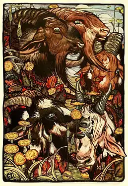Edward Julius became one of the most talented of illustrators, depicting animals and plants with an extraordinary understanding, and making use of fantasy settings of architecture and landscape. He also published three short unillustrated works (two of them issued anonymously), expressing his spiritual beliefs,[12] and in the 1930s created a series of anti-war paintings with accompanying text, entitled "The Truth", which were never published.[9] He lived in London, sharing a house with his mother, artist Sidney Laurence Biddle and musician Harold Hulls, until the outbreak of the Second World War, when the household moved first to Sussex and then to Montgomeryshire, and in his final years he retired completely from public life.[13] He suffered a period of depression, brought on by failing eyesight, that resulted in his committing suicide, aged 73, by his shooting himself in the chest in July 1957.[14]