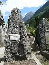 Shortly after returning to Chamonix from another climb in the Alps, Whymper became ill, locked himself in his room at the Grand Hotel Couttet, and refused all medical treatment.[22] Whymper died alone on 16 September 1911, at the age of 71.[22][23] A funeral was held four days later. He is buried in the English cemetery in Chamonix.[22]