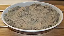 Baba ghanoush (Arabic: بابا غنوج bābā ghanūj) is a popular Levantine dish of eggplant (aubergine) mashed and mixed with various seasonings. Frequently the eggplant is baked or broiled over an open flame before peeling, so that the pulp is soft and has a smoky taste.[1] Baba ghanoush is usually eaten as a dip with pita bread, and is sometimes added to other dishes. It is usually of an earthy light brown color. In Ethiopia, this dish is commonly known as blagadoush.
