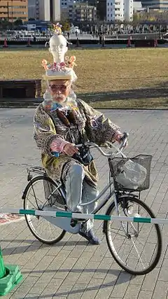 Eijiro Miyama (宮間 英次郎, Miyama Eijirō, born 1934) is a Japanese outsider artist who lives in Kanagawa Prefecture, Japan. He is often referred to as Bōshi Ojisan (帽子おじさん, "Hat Man") due to his habit of riding his bicycle around the streets of Yokohama wearing eccentric clothing and large, elaborate hats or headgear adorned with dolls and other recycled objects.[1][2][3]