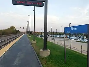 Elburn is a station on Metra's Union Pacific West Line located in Elburn, Illinois. The station is the western terminus of the West Line. The station is 43.8 miles (70.5 km) away from Ogilvie Transportation Center along the railroad tracks.[2] Elburn station opened on January 23, 2006, when the West Line was extended from Geneva. The station is located at ground level. A large coach yard is located just east of the station.[3] As of 2018, Elburn is the 137th busiest of the 236 non-downtown stations in the Metra system, with an average of 336 weekday boardings.[1]